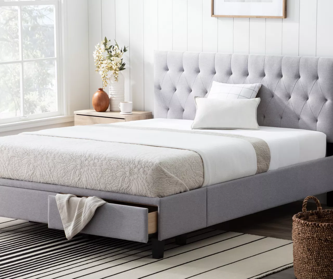 The Brookside Anna upholstered bed with drawers brings classic style and convenient functionality to any room. Thick upholstered side rails flow seamlessly into a diamond tufted headboard for a cohesive look you can build your room around. Included slats easily unroll and have a center support bar to provide lasting comfort. Pre-assembled drawers built into the foot of the bed provide convenient storage space to make this bed beautiful and functional.