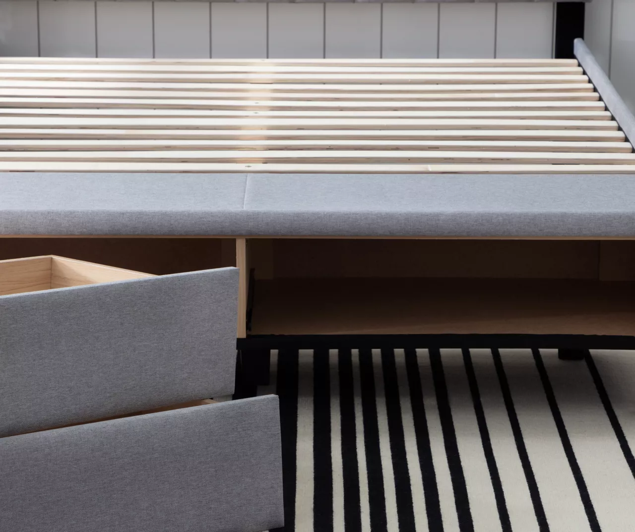 - Beautifully upholstered bed with headboard, drawers, and wooden slats