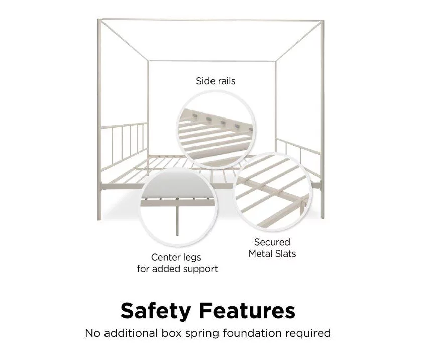 The Novogratz Marion canopy bed is stylish and classy. Designed with a clean silhouette, this eye-catching piece is crafted in solid and sturdy metal that is stable and durable with secure metal slats that do not require a foundation. It comes with a sophisticated headboard and footboard and with metal side rails and center legs to provide full support and comfort to you and your mattress. The Marion is also practical with 11″ of clearance beneath the bed, ideal to store things away.