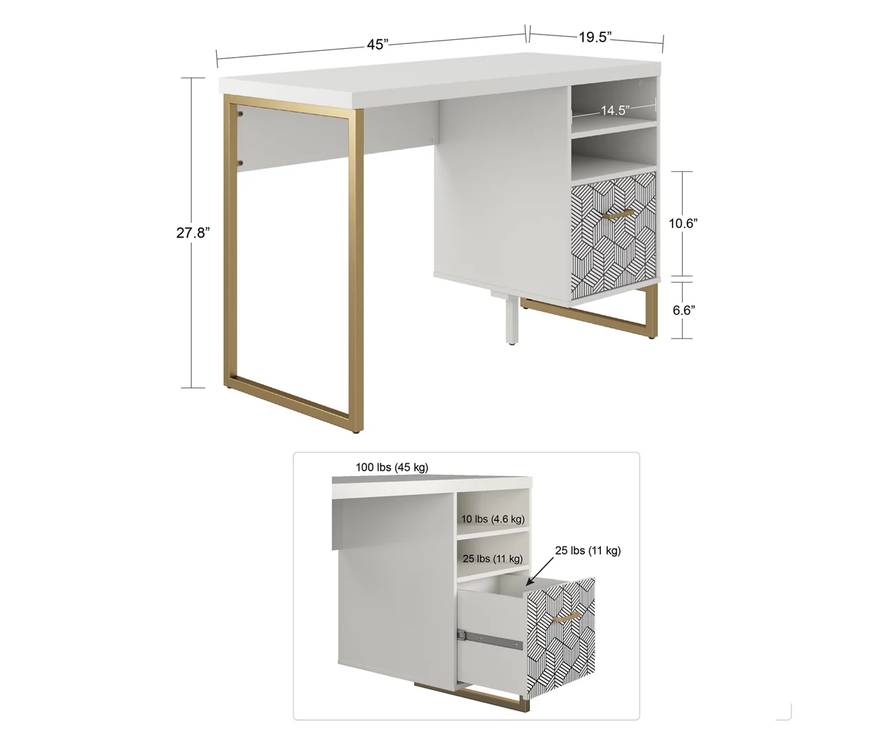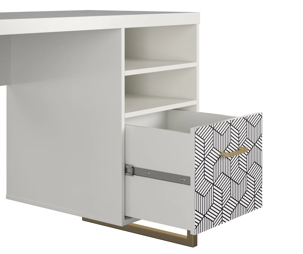 Bow down to the CosmoLiving Scarlett single pedestal desk. Designed with a modern silhouette, the pedestal desk comes in a crisp white finish. The Scarlett is built on durable gold metal legs with a roomy patterned drawer to store your things and two open shelves to obsessorize. Made with your organizational desires in mind, this desk is a match made in home office heaven.